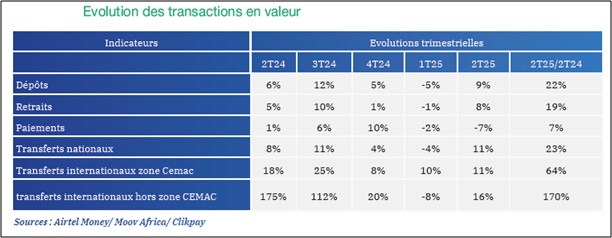 Cette performance est principalement tirée par les transferts internationaux, qui enregistrent des croissances significatives. Les transferts au sein de la zone CEMAC ont augmenté de 11 %, tandis que ceux hors CEMAC ont progressé de 16 % sur le trimestre. En glissement annuel, cette tendance est encore plus marquée. Les transferts au sein de la CEMAC progressent de 64 % et ceux hors CEMAC connaissent une hausse de 170 %, devenant le principal levier de croissance du secteur.