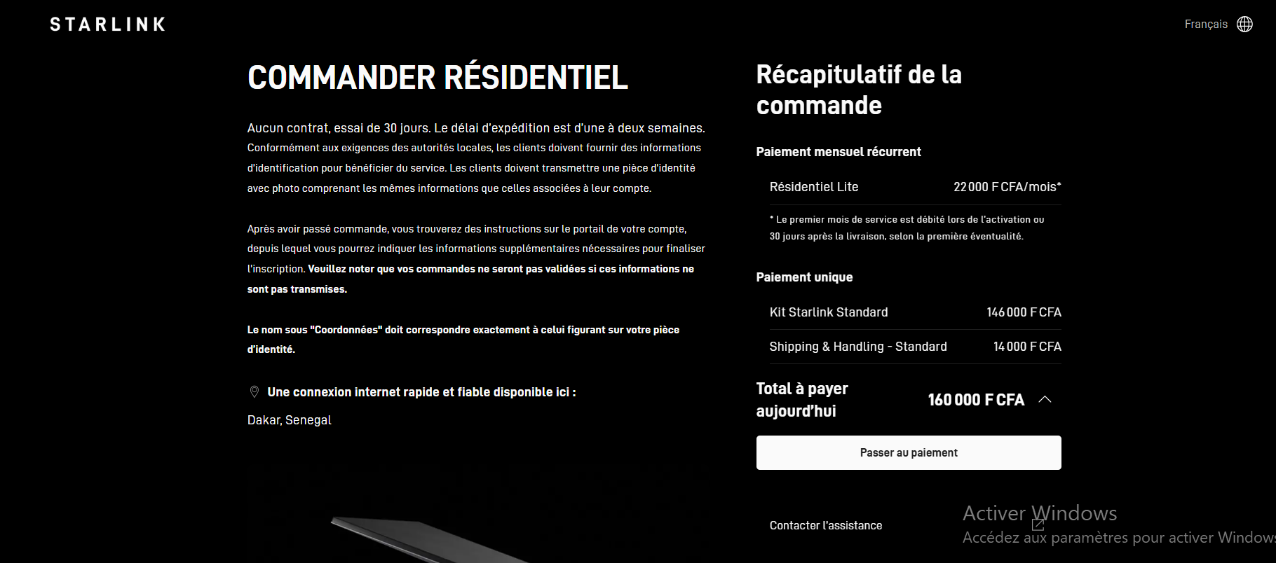 Après inscription sur le site officiel de Starlink puis paiement des frais du kit à 146 000 Fcfa ou 117 000 Fcfa, il faudra un délai d’une à deux semaines pour réceptionner son kit et disposer d’internet de Starlink.