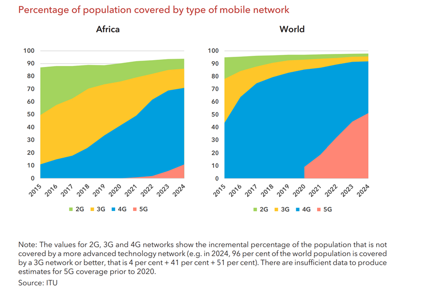 En Afrique, le principal frein à l’accès aux services mobiles n’est plus la couverture réseau, mais le coût des téléphones. Au cours des dix dernières années, les sociétés de téléphonie ont beaucoup investi pour étendre leur couverture et répondre à la demande croissante en connectivité. Ainsi, en 2024, la couverture mobile sur le continent atteignait 86 % pour la 3G, 71 % pour la 4G et 11 % pour la 5G, selon l’Union internationale des télécommunications (UIT). Cependant, seuls 52 % des Africains étaient connectés au haut débit mobile.