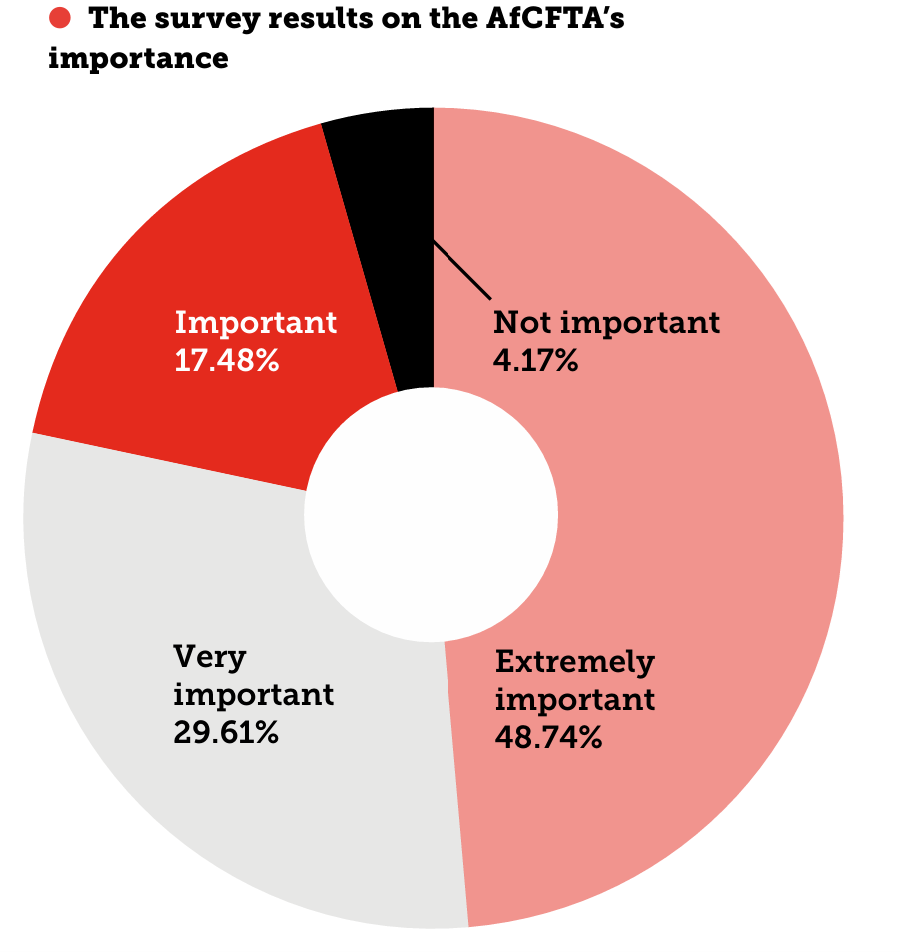 Dans le détail, 48,74 % des dirigeants sondés ont déclaré que la ZLECAf est « extrêmement importante » pour protéger les intérêts commerciaux de l’Afrique, tandis que 29,61 % ont noté qu’elle est « très importante » et 17,48 % l’ont qualifiée « d’importante ». 4,17 % seulement ont indiqué que le marché commun africain « n’est pas important ».