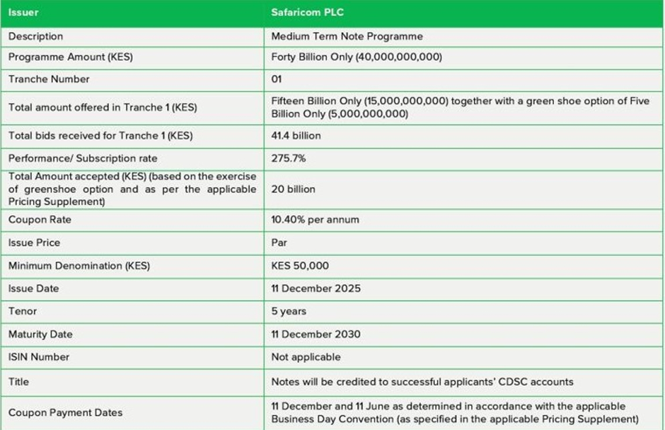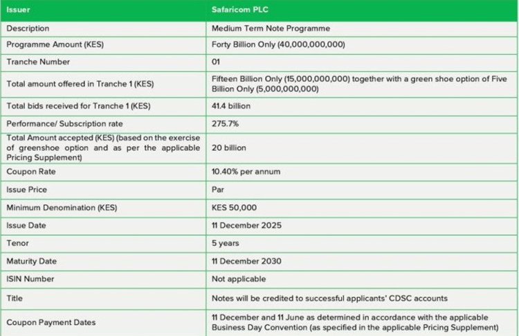 Le marché a en effet répondu bien au-delà des attentes, avec des demandes des investisseurs atteignant 41,4 milliards KES, soit une sursouscription de 275,7 %. « Face à cet accueil favorable du marché, nous avons exercé l’option de surallocation de 5 milliards de KES, portant ainsi l’allocation totale de la Tranche 1 à 20 milliards de KES. Cette décision stratégique répond à la forte demande des investisseurs et renforce la confiance dans notre stratégie à long terme », explique Safaricom.