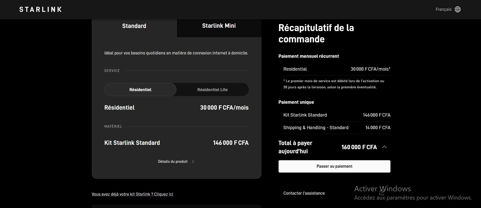 Après inscription sur le site officiel de Starlink puis paiement des frais du kit à 146 000 Fcfa ou 117 000 Fcfa, il faudra un délai d’une à deux semaines pour réceptionner son kit et disposer d’internet de Starlink.